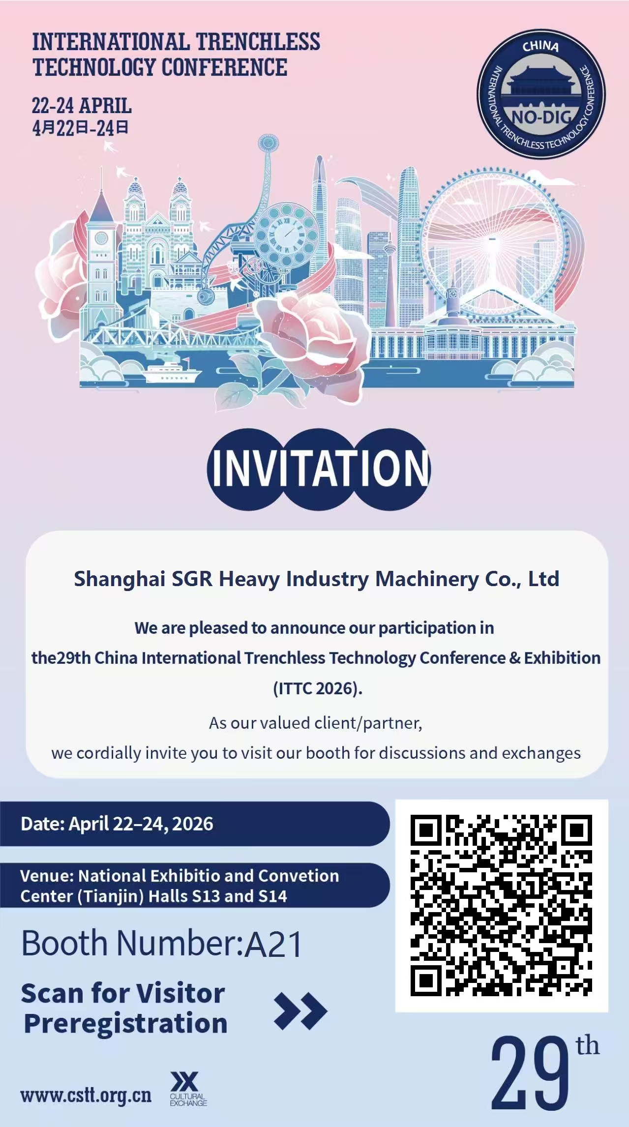 SGR będzie wystawcą na 29. Międzynarodowym Seminarium i Wystawie Technologii Bezwykopowych w Chinach (ITTC2026) Daty: 22-24 kwietnia 2026 r Lokalizacja: Narodowe Centrum Wystawowo-Kongres...